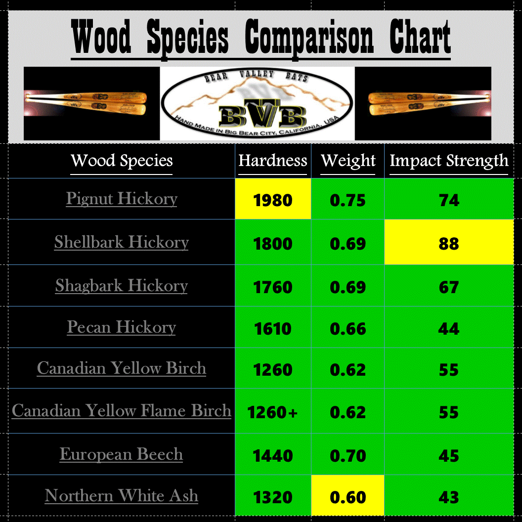 2.) If you want a bat with a -0 or less, then the wood you should consider will be Northern White Ash, Canadian Yellow Birch, Pecan Hickory,